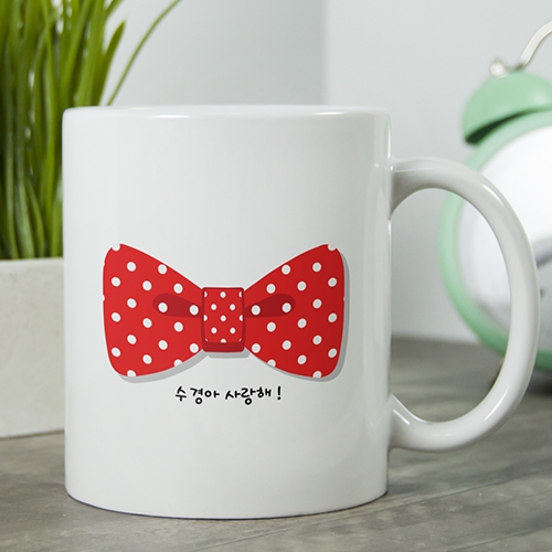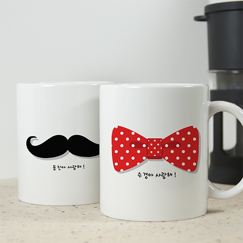 단순화 시킨 리본 및 콧수염을 프린트한 앙증맞은 머그컵 디자인