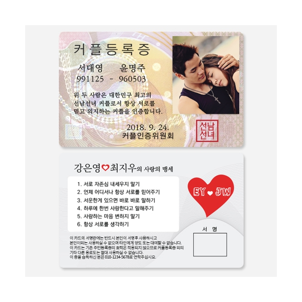 주민등록증 형태를 한 커플등록증 (2장이 1set)으로 커플이 각각 나누어 가질 수 있습니다.