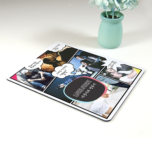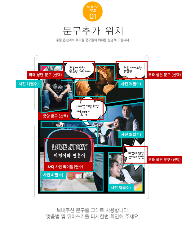다수의 사진을 사용하여 만화책 느낌으로 재미를 강조한 디자인의 마우스패드, 재미있는 대본으로 위트있는 고백을 하는 재미가 솔솔~