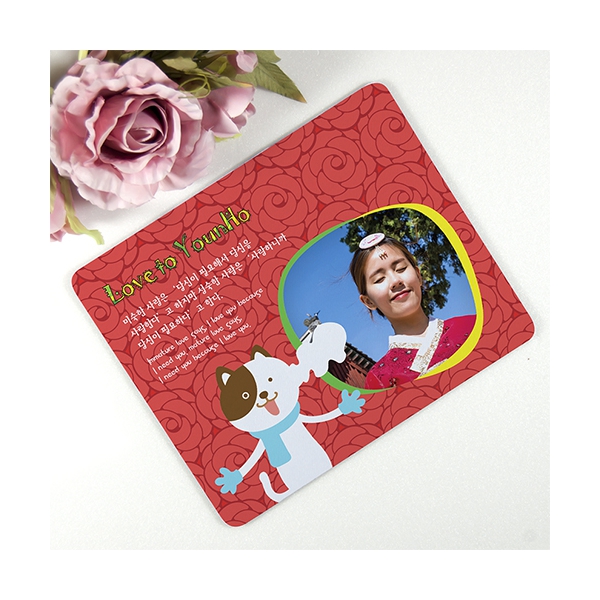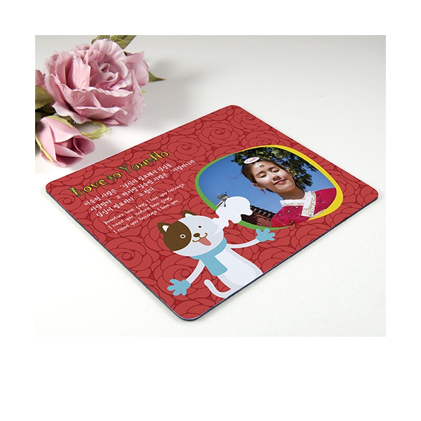 강렬한 다홍색 꽃모양 패턴의 배경과 귀여운 고양이 일러스트로 포인트를 준 디자인