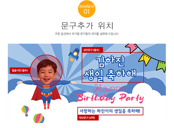 구름을 뚫고 하늘로 날아가는 슈퍼 히어로를 얼굴과 합성한 생일축하 이벤트 현수막